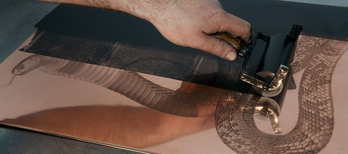 When printing a plate, the printer begins by removing the varnish that protects and preserves it when in storage. After cleaning, he checks that it is in good condition, to ensure a quality print run and avoid damaging the plate. Once this reconnaissance work has been carried out, it's time to print.