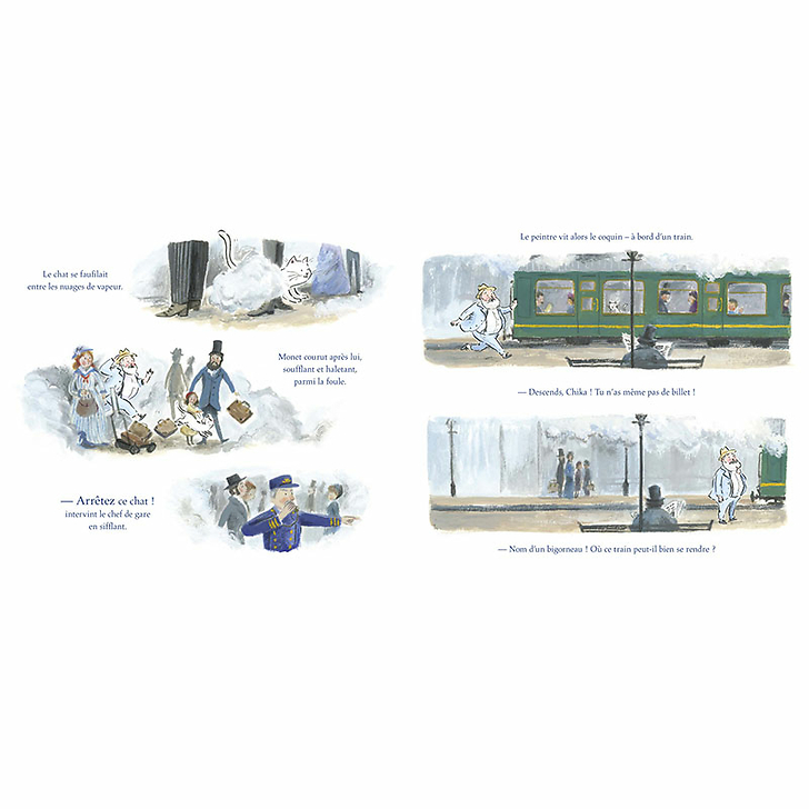 The gardens of Giverny, the Saint-Lazare station, the beach of Trouville, the Japanese bridge become fabulous playgrounds. Phew! Monet finally succeeds in catching her. They return quietly to Giverny, the cat finds its cushion and Monet his famous paintings upside down. What a hullabaloo!