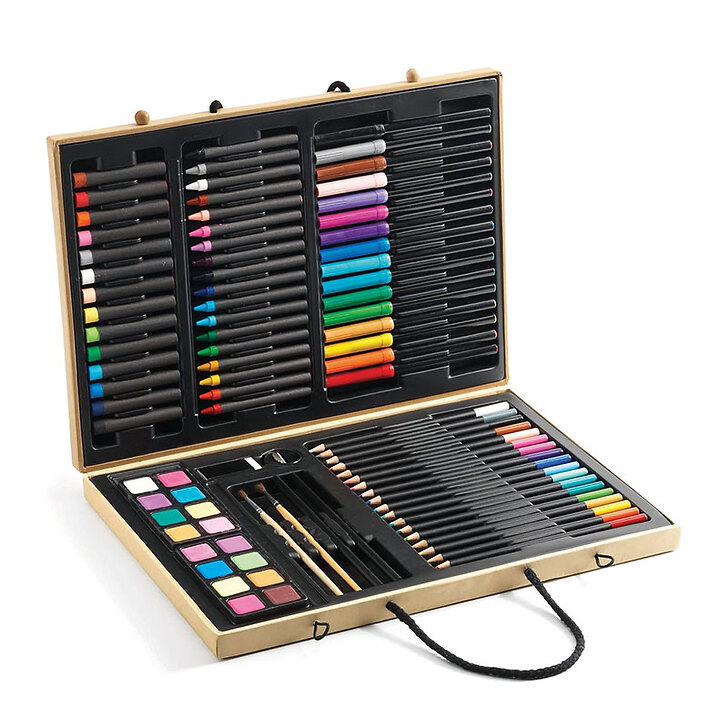 1 illustrated case to personalize, 18 colored pencils, 16 felt-tip pens, 18 wax crayons, 14 oil pastels, 16 paint tablets, 2 brushes, 2 pencils, 1 pencil sharpener and 1 eraser.