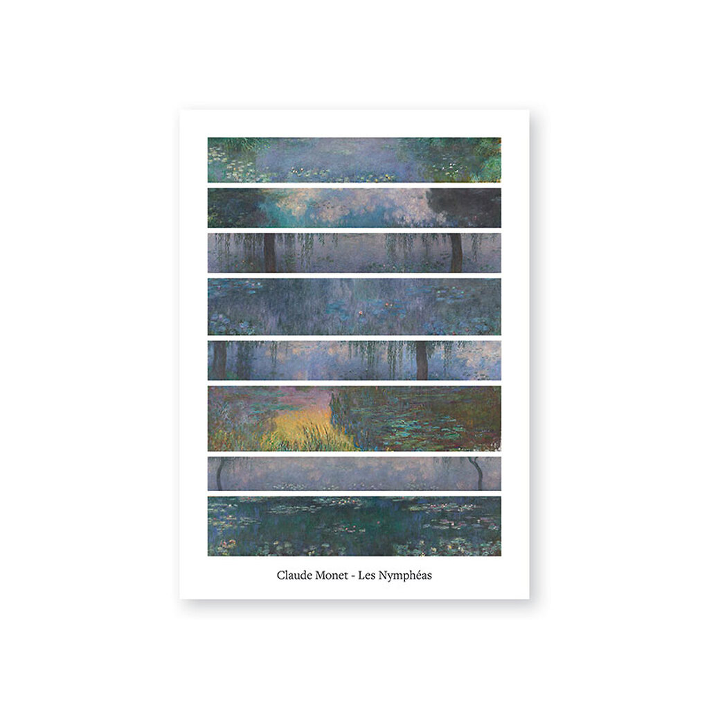 This poster features 8 views of the Waterlilies series by Claude Monet, between 1914 and 1926, kept at the Musée de l'Orangerie.