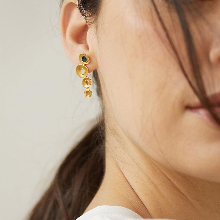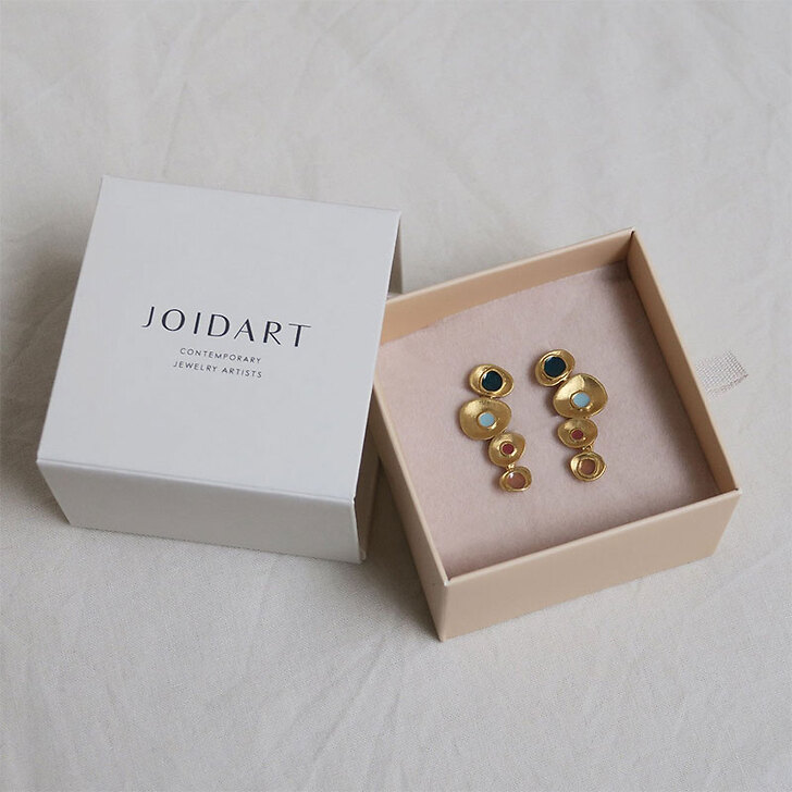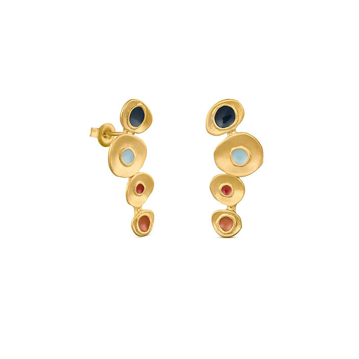 24 K gold-plated matte metal medium stud earrings, made of many irregular shapes with multicolored cold enamel.