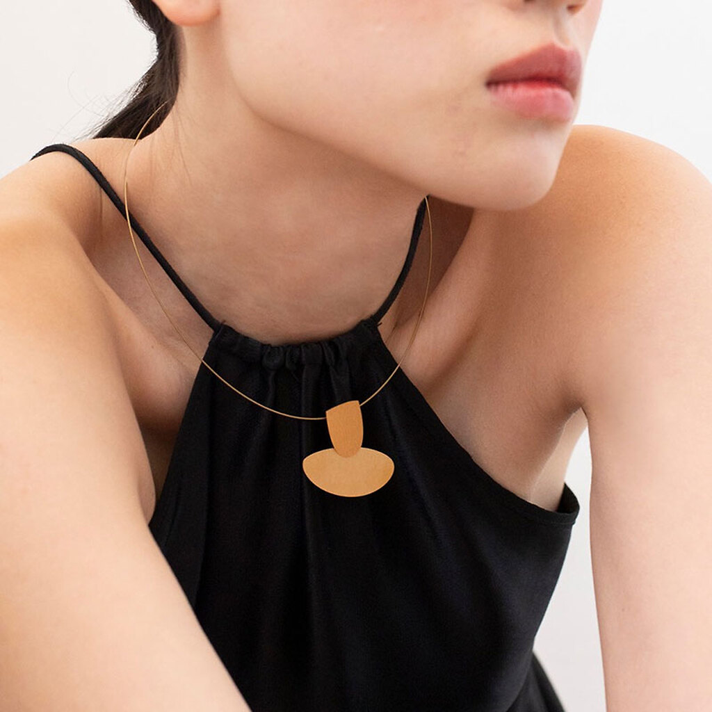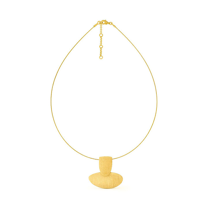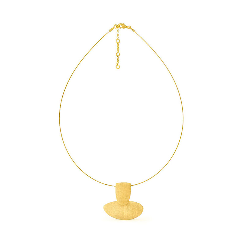 Necklace in 24 K gold-plated matte metal with a pendant in irregular shapes that pay homage to the volumetric female bodies of the iconic marble goddess figures of the Cyclades Islands. Design based on the drawings of Barcelona illustrator and graphic artist Judit Canela.
