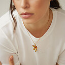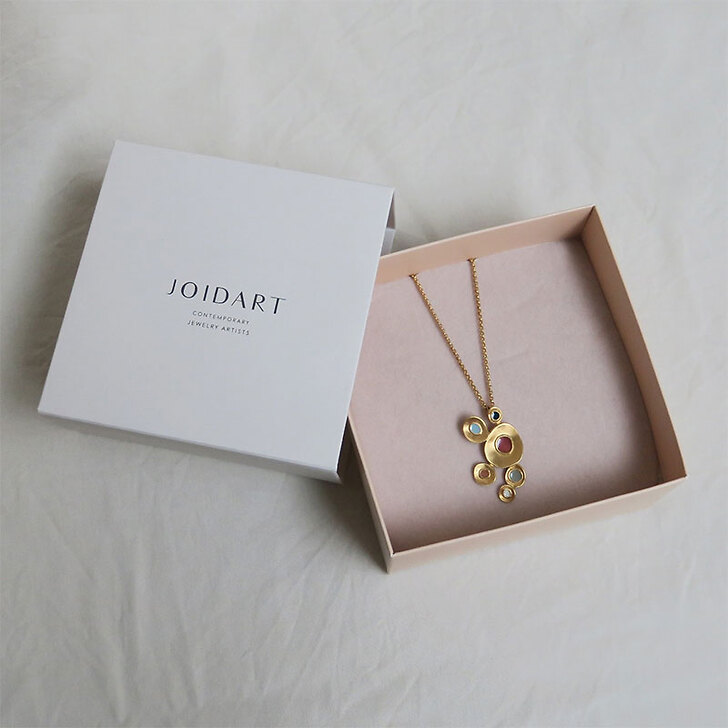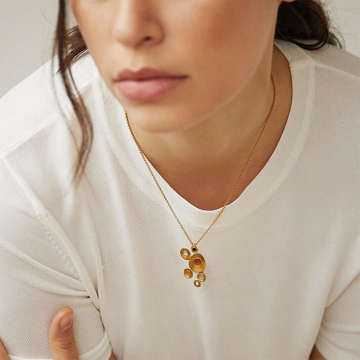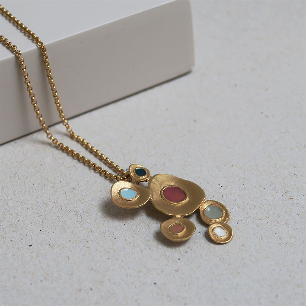 24 K gold-plated matte metal small necklace made of many irregular shapes with multicolored cold enamel and chain.