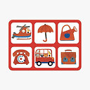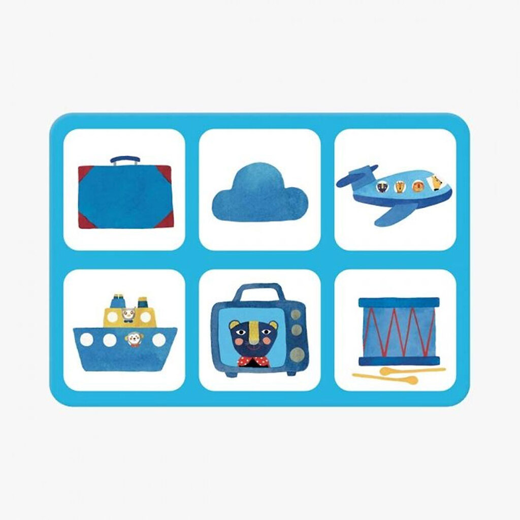 Cardboard arousing game grouping four primary color plates, with illustrations of everyday objects, treated as an imager, taking the graphic association of the range. "A lotto to observe, learn and name colours and objects".