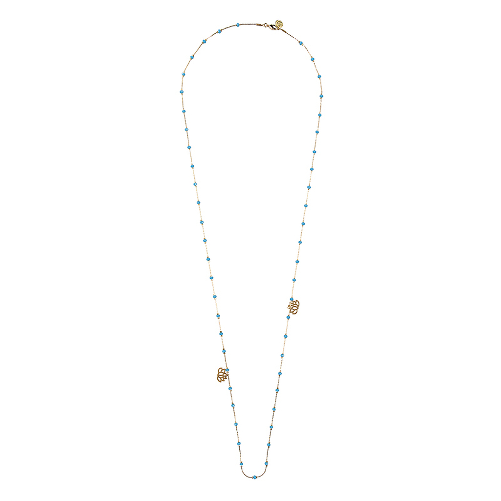 Ce sautoir avec des perles turquoises et deux pendentifs en forme de nymphéas en étain doré est librement inspiré de la célèbre série des peintures de Claude Monet: Les Nymphéas, réalisée entre 1890 et 1926.
