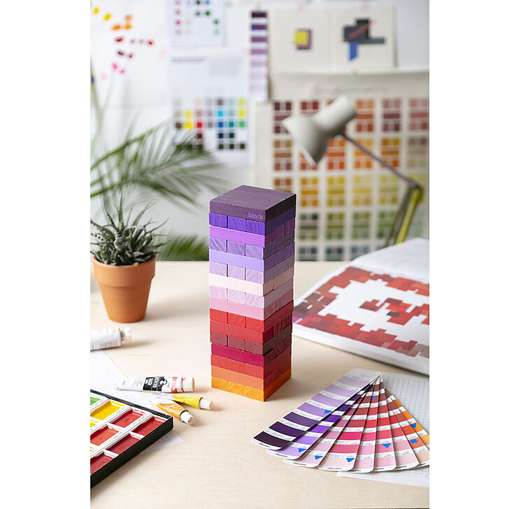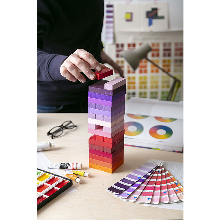 Chaque joueur, à tour de rôle, retire soigneusement un bloc de bois et le place au sommet de la tour. Les couleurs interagissent magnifiquement à mesure que la tour se construit et que le jeu de patience se déroule. La tour devient de plus en plus instable, une main ferme s'impose !