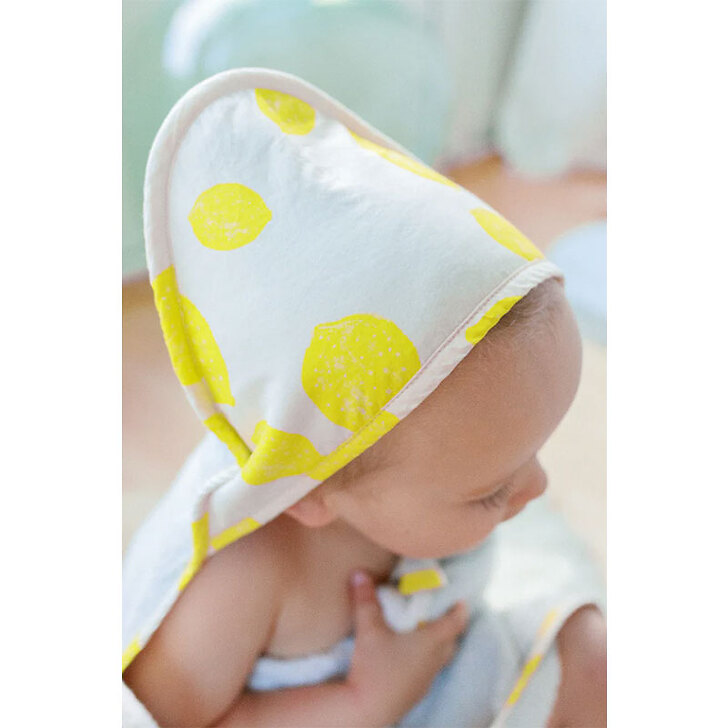 Douce et moelleuse, notre cape de bain Holi and Love avec ses motifs de citrons est parfaite pour sécher et envelopper votre bébé après le bain.