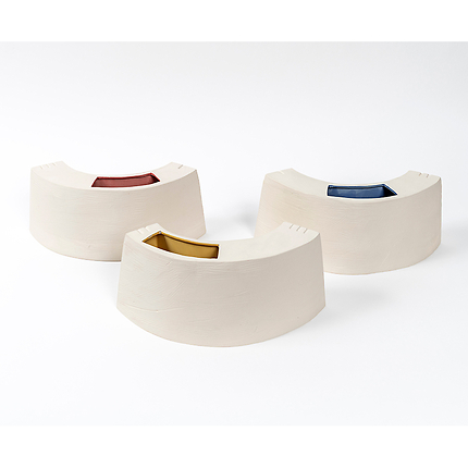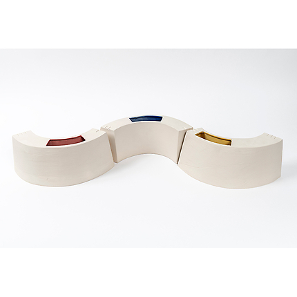 Au cœur de cette collaboration naît également un objet d'art inédit : le vase Matrice. Conçu à partir du moule de la lettre O, ce vase en grès blanc émaillé est à la fois sculpture, réceptacle et jeu de formes. Il se compose de trois sections courbes, chacune percée d'une niche colorée - bleue, rose, jaune - évoquant les couleurs primaires, fondement de toute peinture, et particulièrement présentes dans l'œuvre de Monet. Sa forme ronde fait subtilement écho à l'ovale emblématique des salles des Nymphéas.